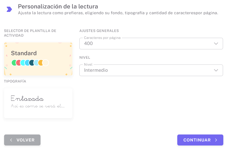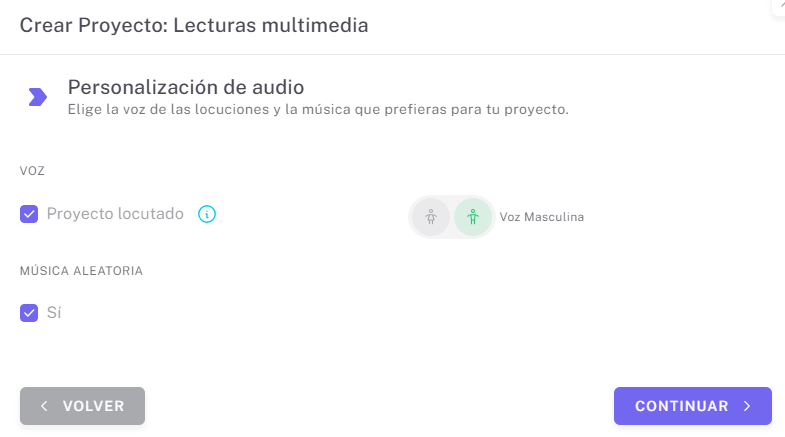 Cuando tengas todas las páginas de tu lectura preparadas, guarda los cambios y haz clic en Continuar. En la siguiente pantalla podrás personalizar las opciones de arte, audio y música de tu proyecto.
