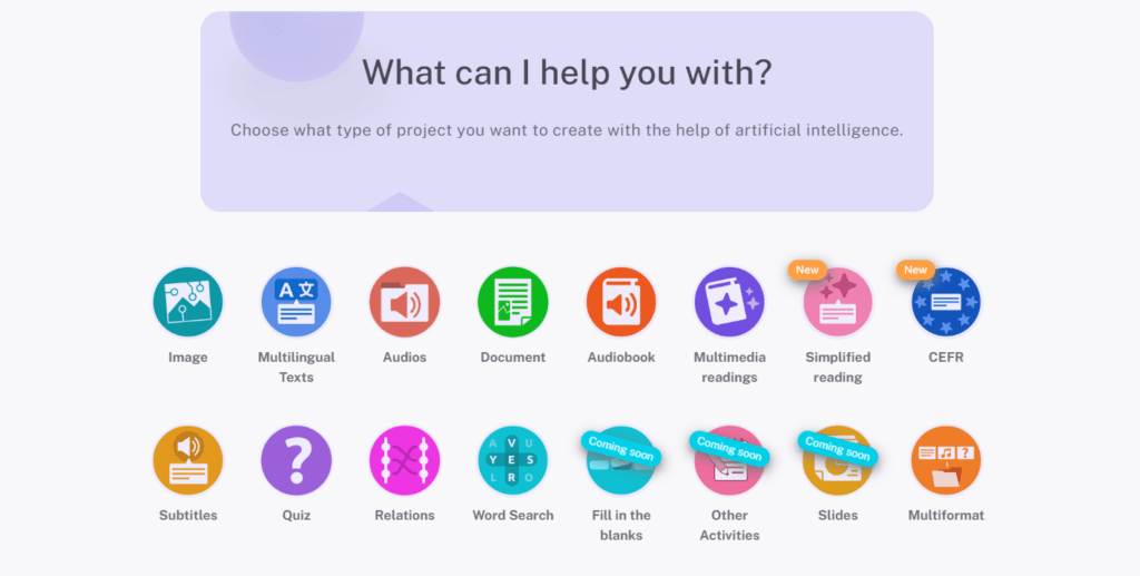 A través de AInara, los equipos docentes pueden generar contenidos como textos, cuestionarios, audiolibros, presentaciones, evaluaciones y actividades interactivas en minutos y adaptadas a las necesidades de su alumnado.